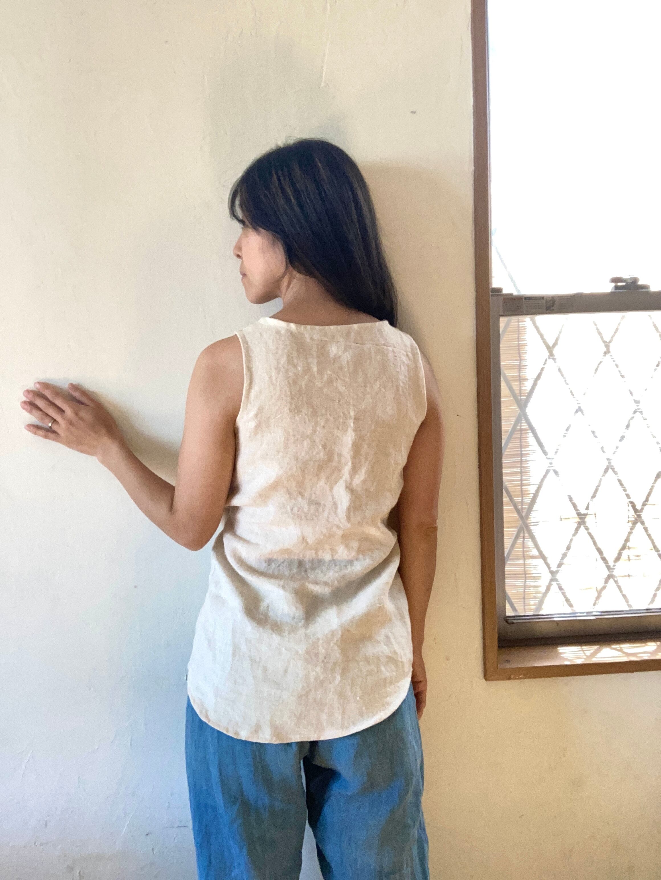 イタリアヘンプ100%、日本で職人さんが機械で織っている、平織生地を使用しています。洗うほどに柔らかく、身体に馴染んできます。丈夫なのに、柔らかくて毛玉も全くできない、不思議な生地です。